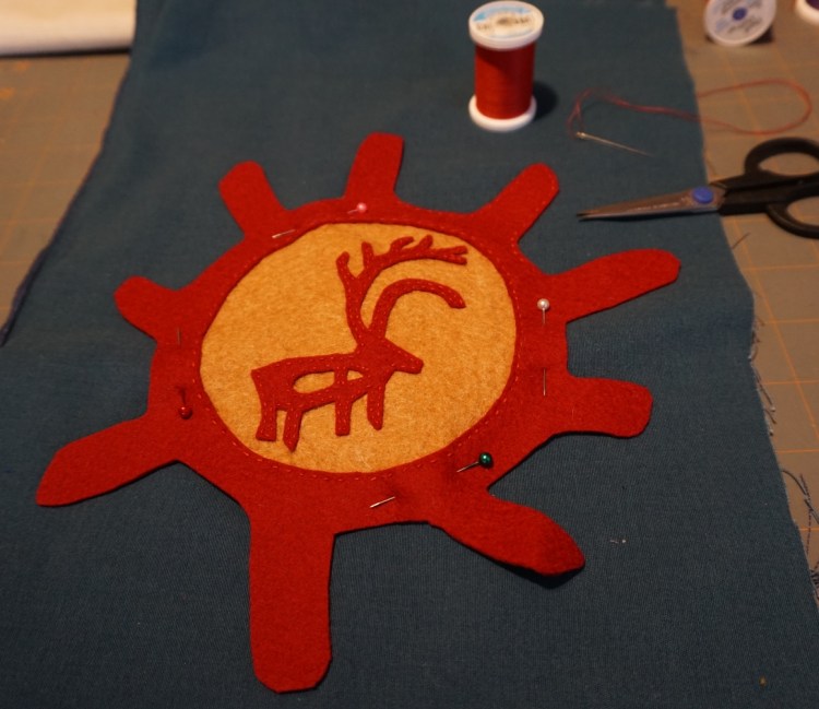 I’m getting ready for my summer trip to Iceland and Finland by immersing myself in some beautiful images. This reindeer is from a book called Scandinavian Folk Patterns, and the sun framing it I found online researching Sami drum symbols. Felt is one of my favorite fabrics to sew because you don’t need to hem it and it makes big bold lines and shapes similar to the ones I like to use in my block prints.