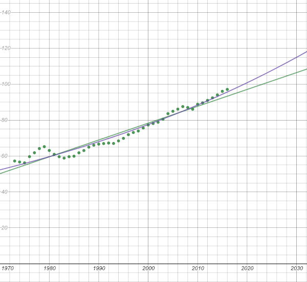 The green dots are the data. The green line is a linear regression (using a line to model the data.) The blue line is an exponential regression (using an exponential curve to model the data.) There are quite a few great questions this graph can generate about the data and the lines that potentially model our future behavior.